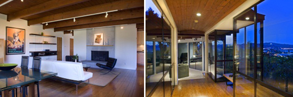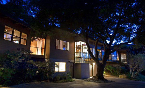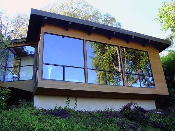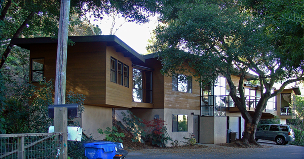 A tree house on the property inspired these flanking pavilions connected by glass bridges that also define the entry and limited outdoor space on a hillside lot.